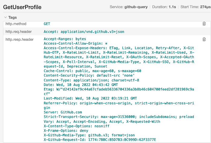 Then click on the details of the span generated by the SDK of GetUserProfile, and you can see that the URL, Method, request header, response status code, response header, response body and other information that we uniformly record in the middleware are all here, very detailed:
